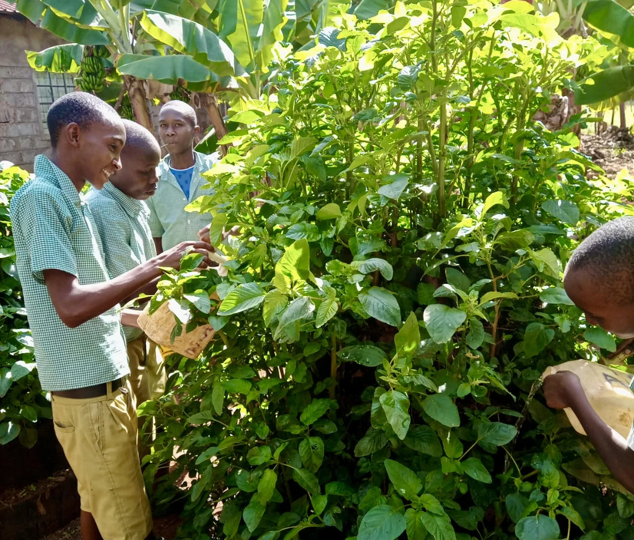 Im Garten wurden Grünkohl, Spinat und Tomaten angepflanzt. Diese ermöglichen Sukuma Wiki mit Ugali, das national Gericht aus Kenia zu kochen. Bestehend aus verschiedenen grünes Gemüse angebraten mit Zwiebeln und Tomaten und evtl. Fleisch und einer festen Griessmasse als Beilage. Dieses Essen gibt den Kindern genügend Nährstoffe und auch Energie für den Tag.